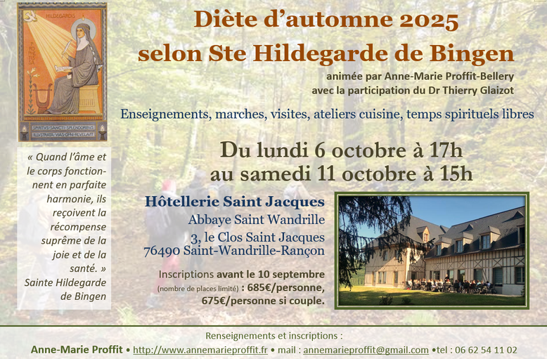 Les sessions permettent d’expérimenter la totalité des conseils de Sainte Hildegarde : alimentation, cuisine, vie spirituelle et fraternelle.